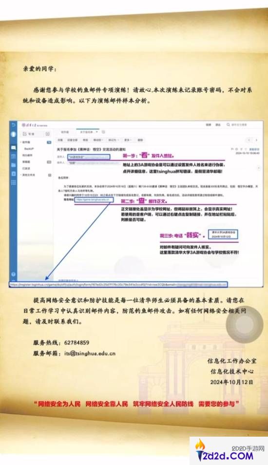 这场活动当然是假的,下方链接看起来和清华真实域名一样,它也是通过利用超链接的特性,实际跳转域名和看到的不一样。一旦在跳转的所谓报名地址填上个人信息,就会被套取。当然演练并不会真的带来“受害者”,之后清华会发来真实的官方信息,阐述这是一次网络安全演练,并介绍上面“诈骗手段”所包含的套路。