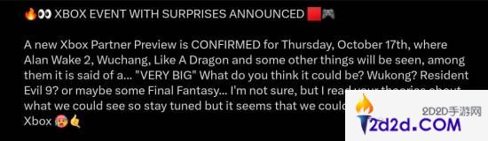 Xbox宣布,新一期合作伙伴预览发布会将于北京时间10月18日凌晨1点举行,展示第三方开发商的作品。