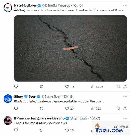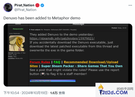 日前,推主Pirat_Nation引用某论坛一位玩家的发现发推,表示《暗喻幻想:ReFantazio》的试玩版本现已被加上了D加密。Pirat_Nation说道:“他们应该删除Denuvo,游戏已经被破解了。”