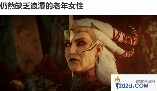 但同时,thegamer表示,社区玩家们抱怨“最年长的可攻略女角色看起来还不到40岁”在此方面,虽然像《龙腾世纪》这样的制作组走在前面,但总体来说,游戏领域还需继续加油。
