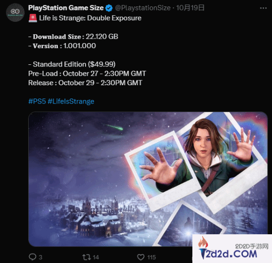 日前,数据博主@PlayStation Game Size透露,Square Enix发行的新作《奇异人生:双重曝光》PS5版本容量为22.12GB,将于10月27日下午2:30开启预载,10月29日正式上线。