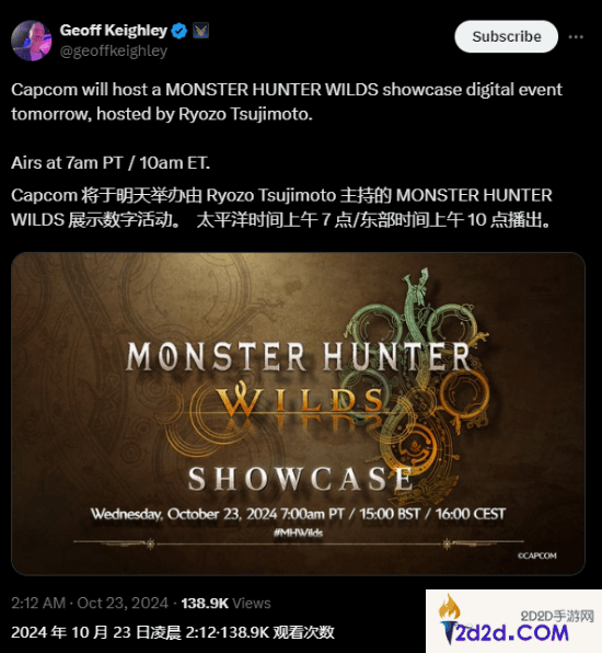 《怪物猎人:荒野》展示会将于北京时间今晚(10月23日)十点播出,制作人辻本良三将亮相,为大家带来该作的最新情报。届时,我们也会第一时间同步进行报道,各位也可关注PlayStation官方油管频道观看直播,敬请期待。