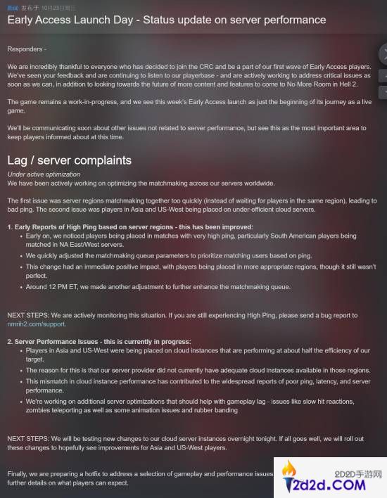 此外,亚洲和美国西部的玩家都被安排在了效率很低的云服务器上(性能是预期一半),因此官方正在进行额外的服务器优化,帮助解决游戏延迟问题。