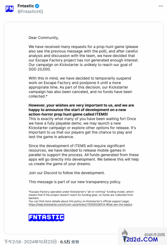 此前报道,《浩劫前夕》开发商Fntastic突然在X发文,表示自己将重新回归,并为自己的新游戏《Escape Factory》发起了众筹,目标为一万五千余美元。