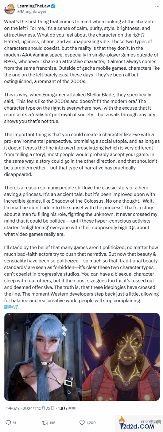 Mangalawyer说道:“当你看到左边的角色时,你首先想到的是什么?对我而言,是平静、纯净、时尚、明亮和吸引力。那你对右边的角色有何感想呢?是憎恶、丑陋、混乱,以及一种不吸引人的氛围。这两种类型的角色本应共存,但现实却并非如此。在现代3A级游戏领域,特别是在非角色扮演类的单机游戏中,每当我分享一个吸引人的角色时,它几乎总是来自同一个系列。除了抽卡类手机游戏外,像左边这样的角色现在几乎已经不存在了,它们几乎已经灭绝,是00年代的残余。”