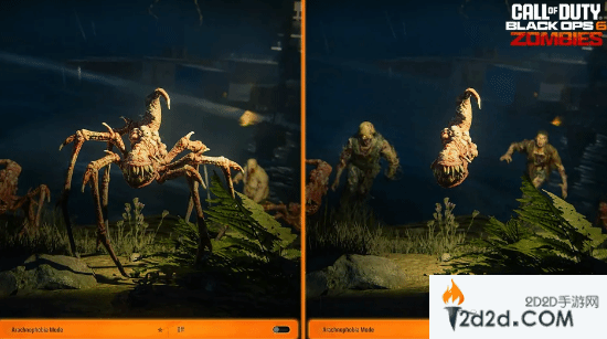 在详细介绍《使命召唤21:黑色行动6》各项辅助功能特性的博客里,动视展示了其全新的蜘蛛恐惧症模式,并解释道:“在游戏的僵尸模式里,将首次推出蜘蛛恐惧症切换功能。此设置允许玩家更改僵尸模式中蜘蛛类敌人的外观,同时不影响他们的游戏体验。”动视还附上了一张对比图。