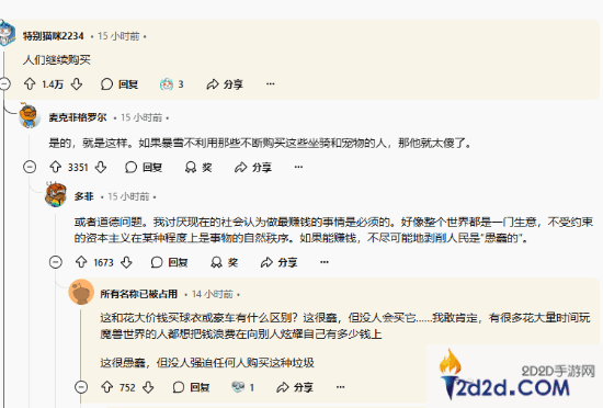 但对于鎏金雷龙的售价,很多外网玩家觉得难以接受,90美元的坐骑售价似乎暗示着暴雪在“测试玩家底线”,有玩家将其行为比作“测水温”。