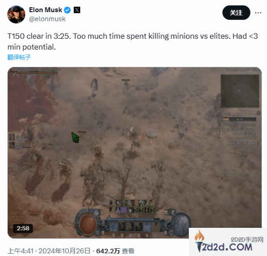 马斯克再晒3:25通关《暗黑4》深坑150层:目标进3分
