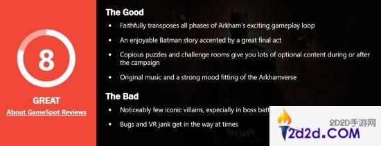 蝙蝠侠VR游戏《蝙蝠侠:阿卡姆之影》在不久前发售,GameSpot给本作打出了8分的评价。评测者表示,本作虽然无法比肩Rocksteady打造的蝙蝠侠主线故事,但体验起来依然非常优秀,如果你有VR设备而且是蝙蝠侠粉丝,本作可以说是必玩游戏。