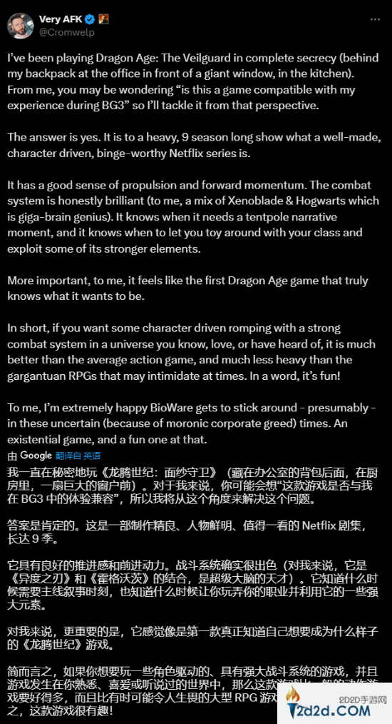 在推文中他提到:“我一直在秘密地玩《龙腾世纪4》,它就像一部制作精良、人物塑造鲜明的网飞剧集一样。本作的战斗系统确实很出色,对我来说就像《异度之刃》和《霍格沃兹之遗》的结合,真是天才的想法。”