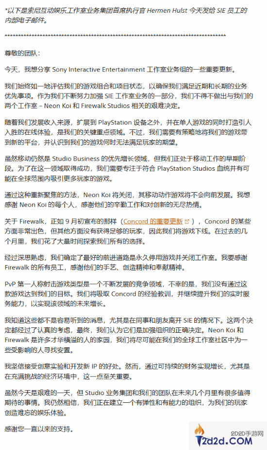 10月30日消息,索尼互动娱乐首席执行官Hermen Hulst通过内部邮件宣布,将关闭作为第一方工作室的《星鸣特攻》开发商Firewalk Studios;同时关闭负责移动游戏业务的Neon Koi工作室。