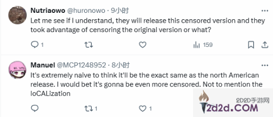 推文随即引发玩家热议,有玩家表示:“我终于能玩到这个游戏了,他们却搞出这种破事,能不能别对人体有这么大的恐惧。”还有玩家表达了更为悲观的态度:“我敢打赌,《异度之刃X 终极版》将会有更多的删减,更别说本地化方面了。”