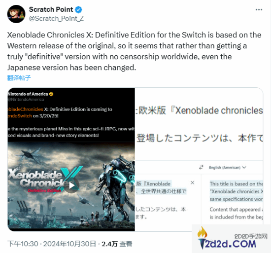 《异度之刃X 终极版》此前已正式公布,游戏将于2025年3月20日发售,登陆Switch。日前,推主发现Switch版本的《异度之刃X 终极版》是基于欧美版的《异度之刃X》进行打造,为全球共通的版本,感慨道:“看来,《异度之刃X 终极版》并不是一款真正没有任何删减的“终极”版本游戏,就连日版也做了改动。”