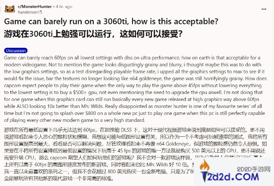 一位玩家在帖子中表示:“我的3060Ti几乎无法流畅运行这款游戏,设置最低画质时帧率都难以达到60fps,实在无法接受!更糟糕的是,游戏画面模糊且颗粒感严重,尽管我将所有画质设置调至最高,仍然看起来像是N64的《黄金眼》。卡普空怎么能指望玩家在仅能以45fps的帧率游玩时,还要花费超过800美元升级整套电脑呢?我的显卡可以轻松应对其他新游戏的高画质,这让我对这款游戏感到非常失望。”