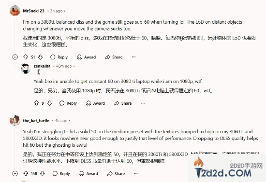 其他玩家也表达了类似的挫败感。一名玩家提到:“我使用3080Ti,开启平衡DLSS,游戏在转动镜头时帧率依然低于60。”还有玩家表示:“我在1080p分辨率下,使用3080 Ti笔记本,仍然无法稳60fps,真是不可思议。”另一位则提到:“即使在中等设置下,将纹理调至高,我的3060 Ti和5800X3D也只能勉强维持50fps,画面质量与性能不成正比。”