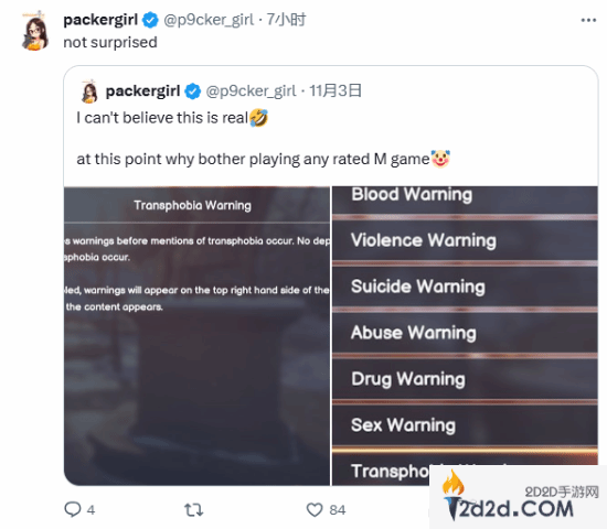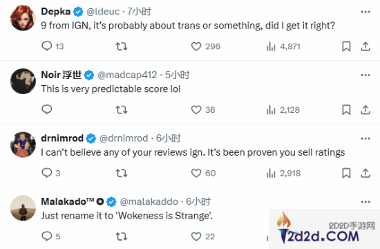 一些玩家锐评:“IGN能给它9分,可能是因为涉及跨性别或类似原因吧,我猜得对吗?”“干脆叫《觉醒人生》或者《奇异觉醒》得了。”还有玩家引用《奇异人生:双重曝光》里面的“跨性别恐惧”等警告选项图说道:“我一点也不惊讶了。”