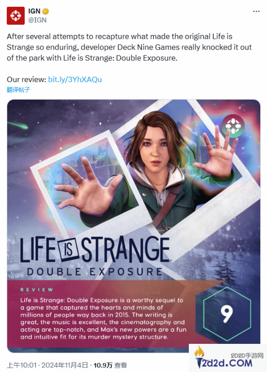 《奇异人生:双重曝光》已经正式发售,IGN曾为本作给出了9分的高分评价。11月4日,IGN再次转发了这则评分,但随即引来玩家嘲讽。