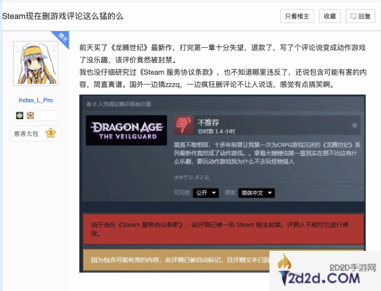 日前,有玩家发帖表示,自己玩完《龙腾世纪4》后,对该作不满意,退款打了差评,结果该评价被版主封禁。