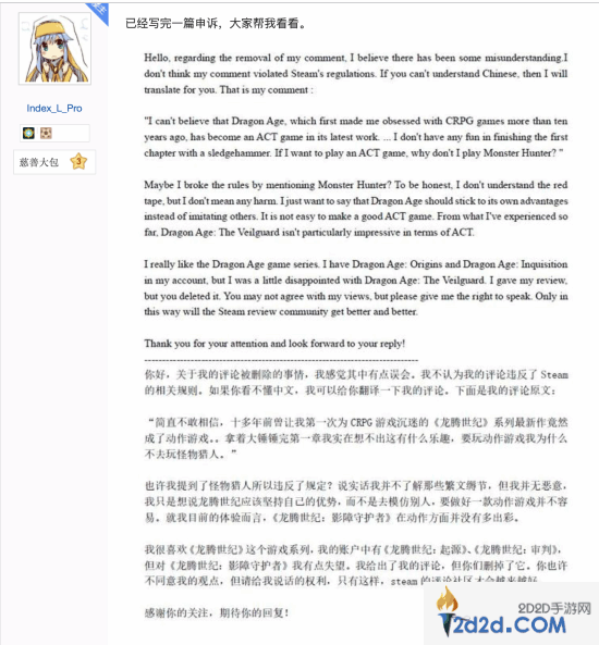对此,该玩家特地写了一篇申诉,希望评价能恢复。