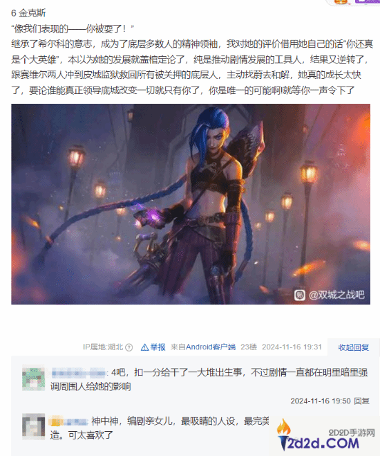 此外,玩家们对于金克丝和蔚这对站在对立面的姐妹评价都褒贬不一,有人认为金克丝的人设在第二季已经快速成长了起来,变得有担当敢作为。但也有不少人指责金克丝的恶行,认为她是纯粹的疯子。