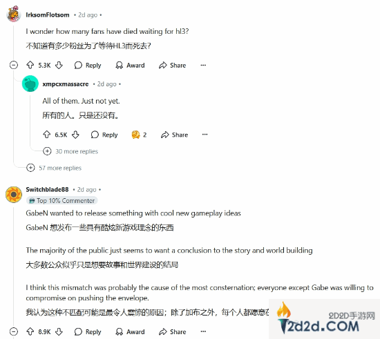 这些未完成的故事和游戏设计再次激起了玩家的热情。在Reddit上,关于《半条命3》的讨论火热展开,许多网友感慨万千。