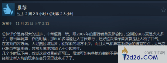 给出好评的玩家表示,《潜行者2》相较于前作有着很大的进步,整体完成度非常高。大地图区域相当多,能探索的地方不少。天气变化很有氛围感,异常系统也增加了趣味性。对于情怀老粉来说,游戏能够平稳落地就很满意了。