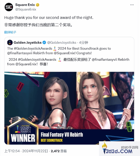 而随后,SquareEnix官方分别转发了金摇杆官方的两篇推文,表示:“当晚的第一个奖项,谢谢你。”“非常感谢您授予我们当晚的第二个奖项。”