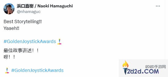 而后,游戏制作人滨口直树也发布推文,晒出了自己的最佳叙事奖杯。