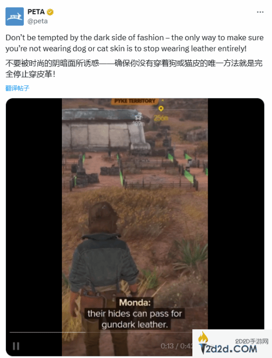 但有一家国际媒体在近日对本作倾注了“感情”,它就是善待动物组织PETA,它制作了一段视频,以游戏中的一段剧情为引子,批判了游戏中的黑商不仅贩卖皮革,还将狗皮/猫皮来当成牛皮贩卖,振臂高呼:确保你没有穿着狗或猫皮的唯一方法就是完全停止穿皮革!