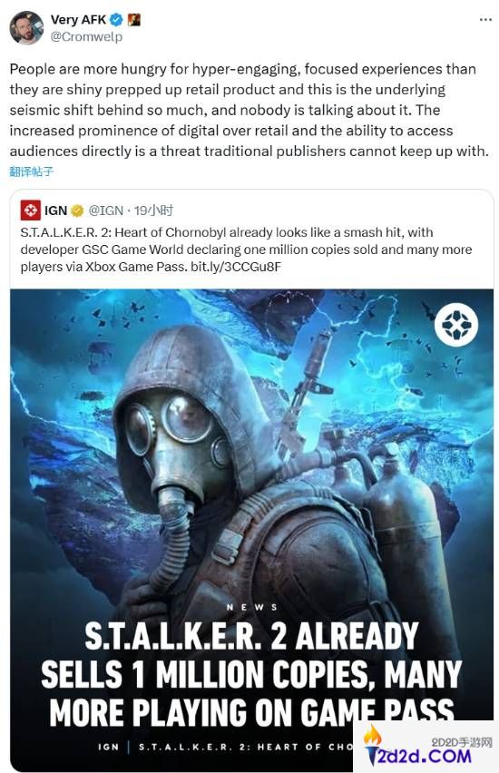 拉瑞安营销总监对此很有同感,毕竟他们去年也发售了题材小众但取得巨大成功的《博德之门3》,他发推评价道:“人们如今更渴望高度吸引人、专注的游戏体验,而不是那些经过精心包装、迎合零售市场的产品。这种深层次的转变是当前游戏行业的‘地震式变化’背后的根本原因,但却几乎没有人提及。数字发行的重要性超过了传统零售,开发者能够直接触达玩家群体,这对传统发行商构成了巨大的威胁,而他们已经无法跟上这种变化。”