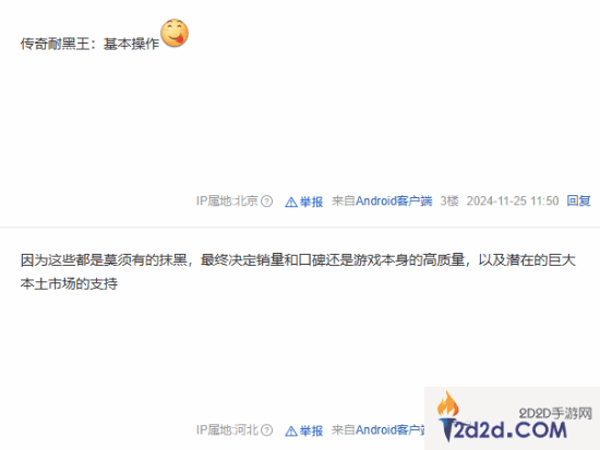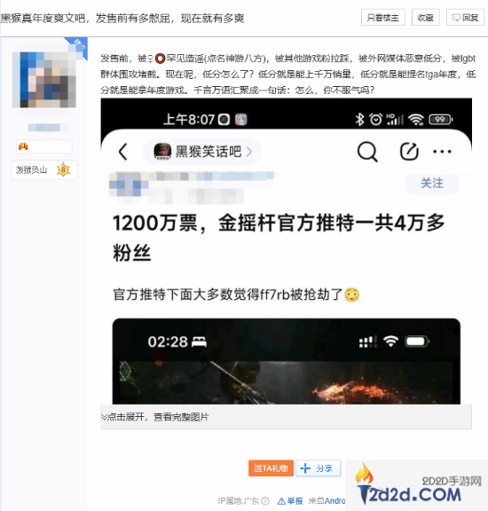 在《黑神话:悟空》经历了这些事件后,有玩家发帖表示《黑神话:悟空》可谓是“年度爽文”,发售前有多憋屈,现在就有多爽,并列举了一些例子来佐证自己的观点。帖主的观点得到了很多玩家的认同,有玩家表示最终决定销量和口碑还是游戏本身的高质量,光靠这种“莫须有”的抹黑是没有用的。“那黑猴被押在舆论场上,抹黑诽谤,围攻群殴,毫发无伤。”