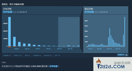 国产游戏《黑神话:悟空》自正式发售以来,迅速获得了玩家的热烈反馈。截至目前,游戏在Steam平台的用户评测数量已突破100万条,达到了1,002,968篇,其中简中评测达到905,170篇,游戏目前Steam评价好评如潮。