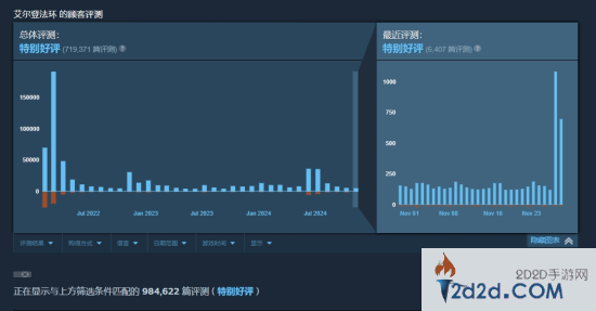 与2022年2月25日发售的《艾尔登法环》相比,《黑神话:悟空》在短短三个月内的评测量已超过其同类大作。《艾尔登法环》目前的评测总数为984,622篇,且获得了“特别好评”的评价。