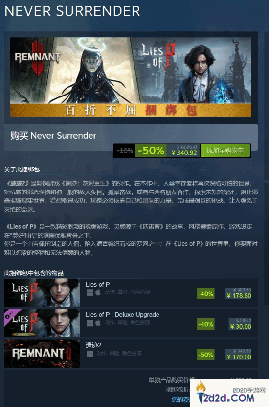 该捆绑包包含了《匹诺曹的谎言:豪华版》(包括本体和豪华升级包)以及《遗迹2 终极版》(包含本体和三款DLC),并且在各自的原有折扣基础上,再提供额外10%的折扣。