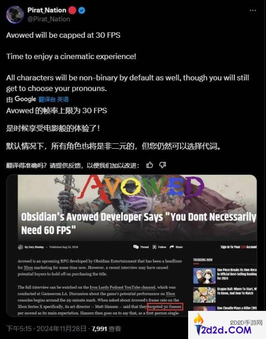 继昨日吐槽《宣誓》女NPC像面粉一样丑后,游戏博主Pirat_Nation今日又找到了新的吐槽点。他发文阴阳:“《宣誓》锁30帧,正好让我们享受电影般的体验。默认情况下,所有角色都非二元性别,玩家仍可以选择性别代词。”