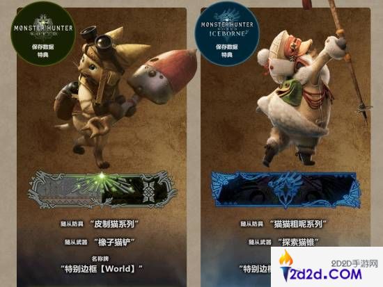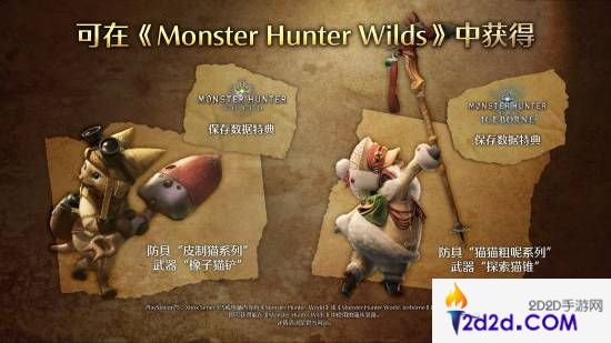 如果拥有《怪物猎人世界:冰原》且完成本体主线故事,并开启DLC新内容,还可额外在《荒野》中获得随从防具“猫猫粗呢系列”、随从武器“探索猫锥”和特别边框【Iceborne】。