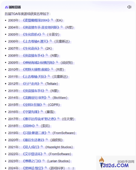有玩家发帖表示自己在百度里搜索“历届TGA年度游戏”关键词时,得到了百度AI的回答结果。在回答里,百度AI表示2024年获得TGA年度游戏者为《黑神话:悟空》,鉴于TGA 2024在12月13日才举行颁奖仪式,可以得知百度AI的这一回答为错误。经过笔者查证,确有此事发生。