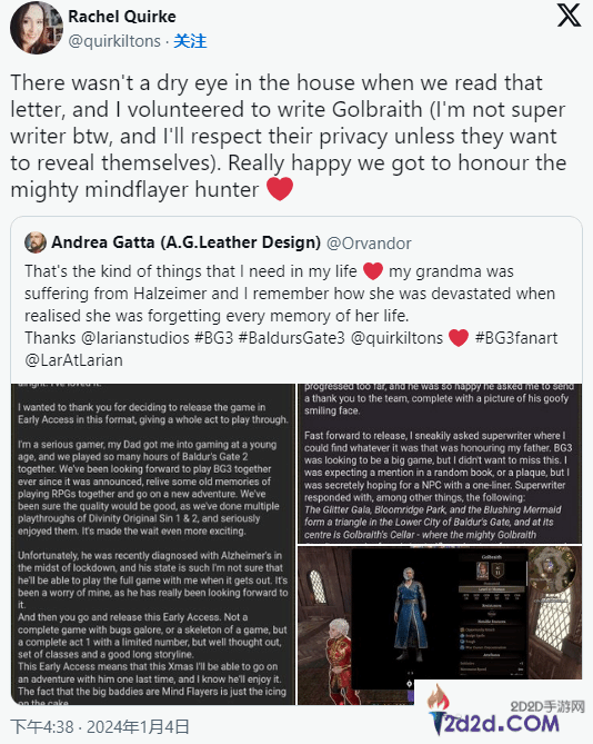 在2020年《博德之门3》抢先体验版发售时,一位名为Solfalia的用户在论坛分享了一篇帖子,感谢拉瑞安发布了游戏的EA版本,能够让他和自己的父亲共同冒险,享受游戏的乐趣。但不幸的是,这位父亲在最近诊断出患有阿尔茨海默病。