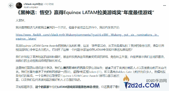 而就在颁奖典礼后,Equinox LATAM创始人RealTurnpiker在Reddit论坛上发文介绍:“拉美游戏奖”旨在从拉丁美洲的文化角度出发,表彰世界范围内视频游戏行业中最杰出的人物和游戏。所有奖项都是由拉丁美洲的玩家们投票决定的,完全遵循了当地玩家们的品味和偏好。