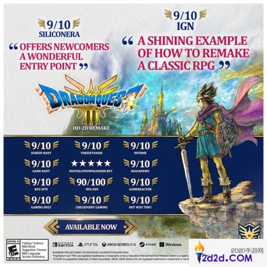 《勇者斗恶龙3 HD-2D重制版》媒体赞誉图公布:满屏9分好评!