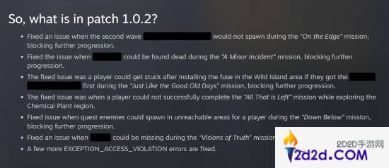 这些修复涵盖游戏中的六个任务,基本都是在某个环节出现角色消失或者任务逻辑冲突等BUG,从而导致任务无法继续进行,可以说是比较严重的卡关BUG。此外,这次更新还修复了一些EXCEPTION_ACCESS_VIOLATION错误。