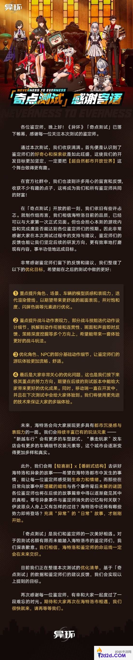 开放世界RPG新作《异环》的“奇点测试”今日正式结束,游戏官方发布感谢信,向参与测试的玩家们致以感谢,并分享了团队未来的优化方向。