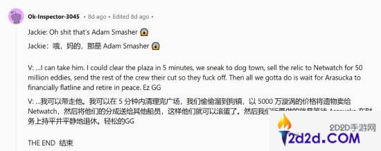 至于满级的V进大厦会发生什么,自然什么都不会发生,依然是按固定剧本进行。但设想一下,如果真有这么一位新手村神仙跟荒坂赖宣和亚当重锤撞上,恐怕对面能做的只有逃命和滑跪。
