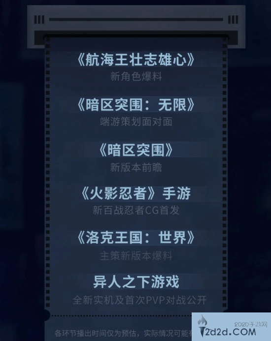 目前已经确认将会亮相的游戏包括《航海王壮志雄心》《暗区突围:无限》《暗区突围》《火影忍者手游》《洛克王国世界》《异人之下游戏》。