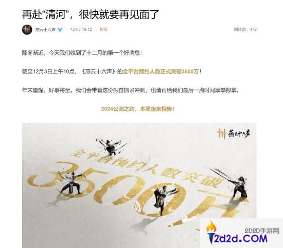 官方表示:“截至12月3日上午10点,《燕云十六声》的全平台预约人数正式突破3500万。年末重逢,好事将至。我们会带着这份振奋抓紧冲刺,也请再给我们最后一点时间摩拳擦掌。2024公测之约,本周定来相告!”