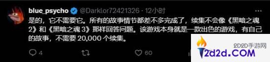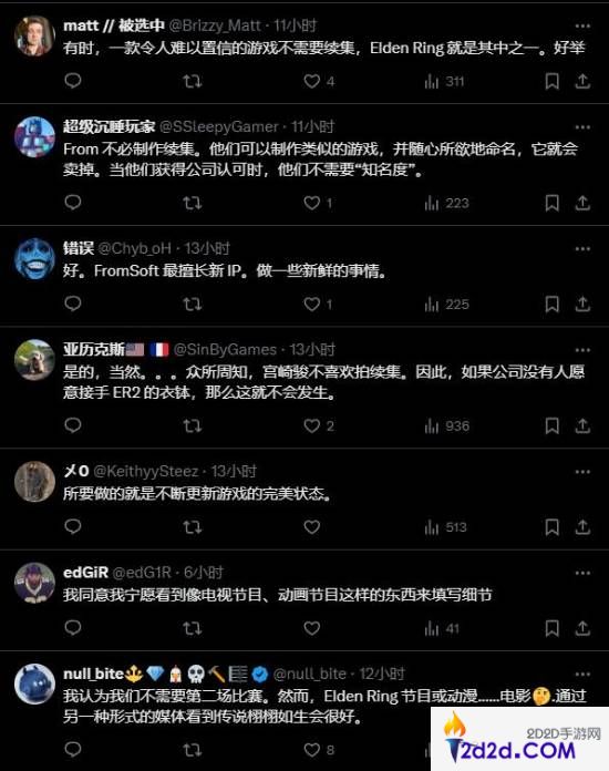 对此,国外玩家也留下了自己的想法。很多人表示《艾尔登法环》本身已经很棒,故事剧情比较完整,确实没必要出续作。只需要不断更新游戏使其更完美,或者推出一些电视动画节目以补充细节就行。