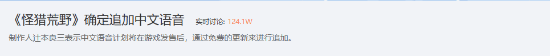 截至发稿前,“《怪猎荒野》确定追加中文语音”词条登上了贴吧热议榜的第二名,众多玩家纷纷对此表示认可,说道:“这下没有任何不买的理由了!”鉴于此前有玩家曾向卡普空请愿为《怪物猎人:荒野》添加中配,有玩家表示:“感谢所有争取中配的玩家,尤其请愿的玩家,因为你们的努力,卡普空才会确定在后续推出中配语音包。”
