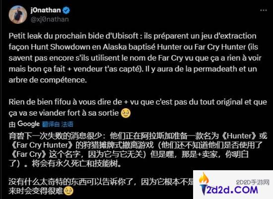 法国知名游戏油管主j0nathan透露,育碧正在准备名为《Hunter》或《孤岛惊魂Hunter》的新作,游戏中包含永久死亡模式和技能树。至于命名,本作和《孤岛惊魂》没什么关系,因此育碧还不确定是否要顶着FarCry的IP。