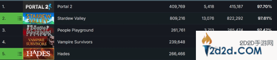 作为Steam上最受欢迎的游戏之一,《星露谷物语》以近70万条评价获得了“好评如潮”的评价。97.6的好评率仅次于《传送门2》的97.7%。