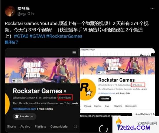 国外推主ege发现,R星的Youtube频道上出现隐藏视频。两天前,页面显示有374条视频,而当他今天再次查看时,发现数字变为了376,说不定R星已悄悄上传《GTA6》的预告片并设置隐藏。